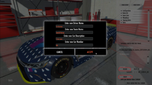 Bring rFactor 2 back up. If you merely alt-tabbed out of game, click the "reload" button in the tuning window. If you exited the game, navigate back to the car where you generated the directory. Now click the arrows labeled "variants" until your new skin shows up on the car. Now click the "Create" button at the very bottom of the screen (NOT "create dir"!). A menu will pop up asking for inputs. This is where you will input your driver and team name, your car description, and car number. Do this and click accept (Fig. 4). If you are submitting this skin for a series, copy down whatever you input into these field word-for-word and send them along with your skin.