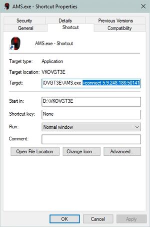 Right click AMS.exe and click Create Shortcut. Right click the shortcut and add the highlighted line in the image to the right after AMS.exe in the Target line but replace the IP with 149.202.51.125:50041. Using this shortcut will launch the game and bring you to the car select screen for the server. If you want to do things such as changing sound or graphics options, launch the game with the normal AMS.exe.
