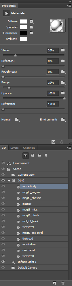 Start up Photoshop, File-> Open-> Choose your cars 3D-model. You should be seeing something like this (Fig 1.):