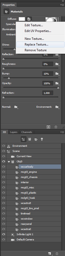 Now click on the small icon next to Diffuse texture setting and choose "Replace Texture..." (Fig 3.)